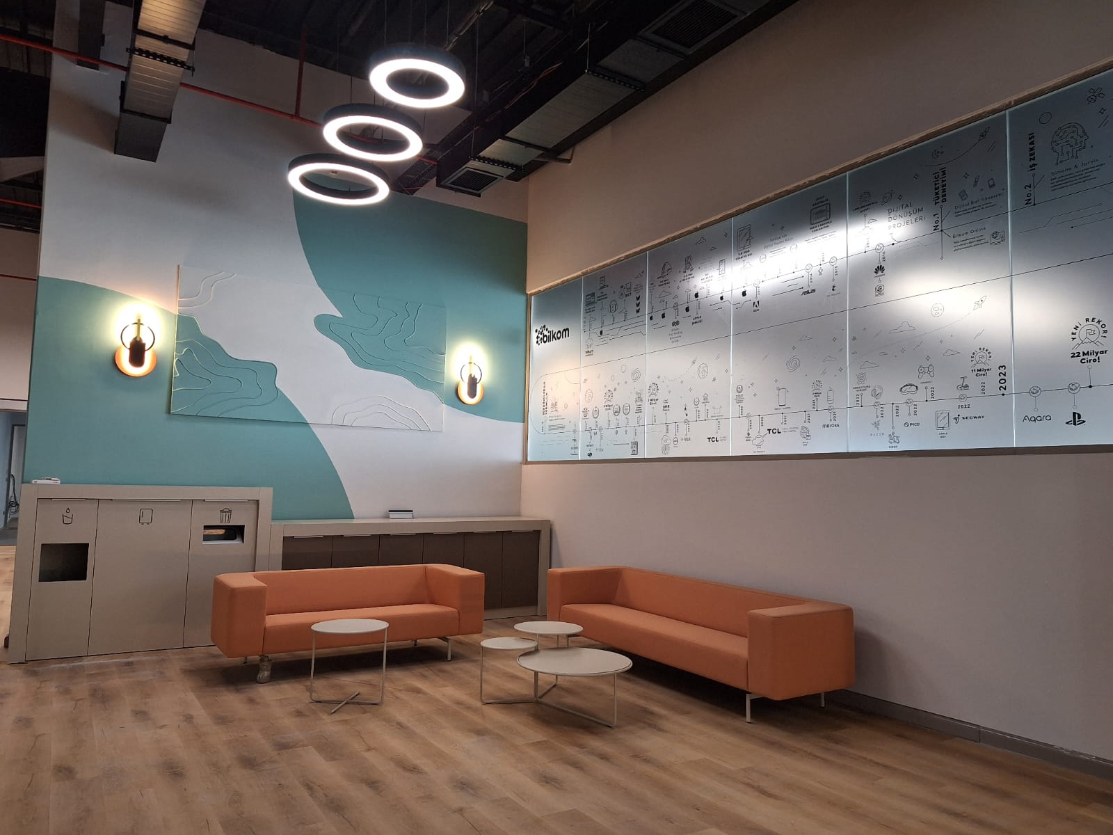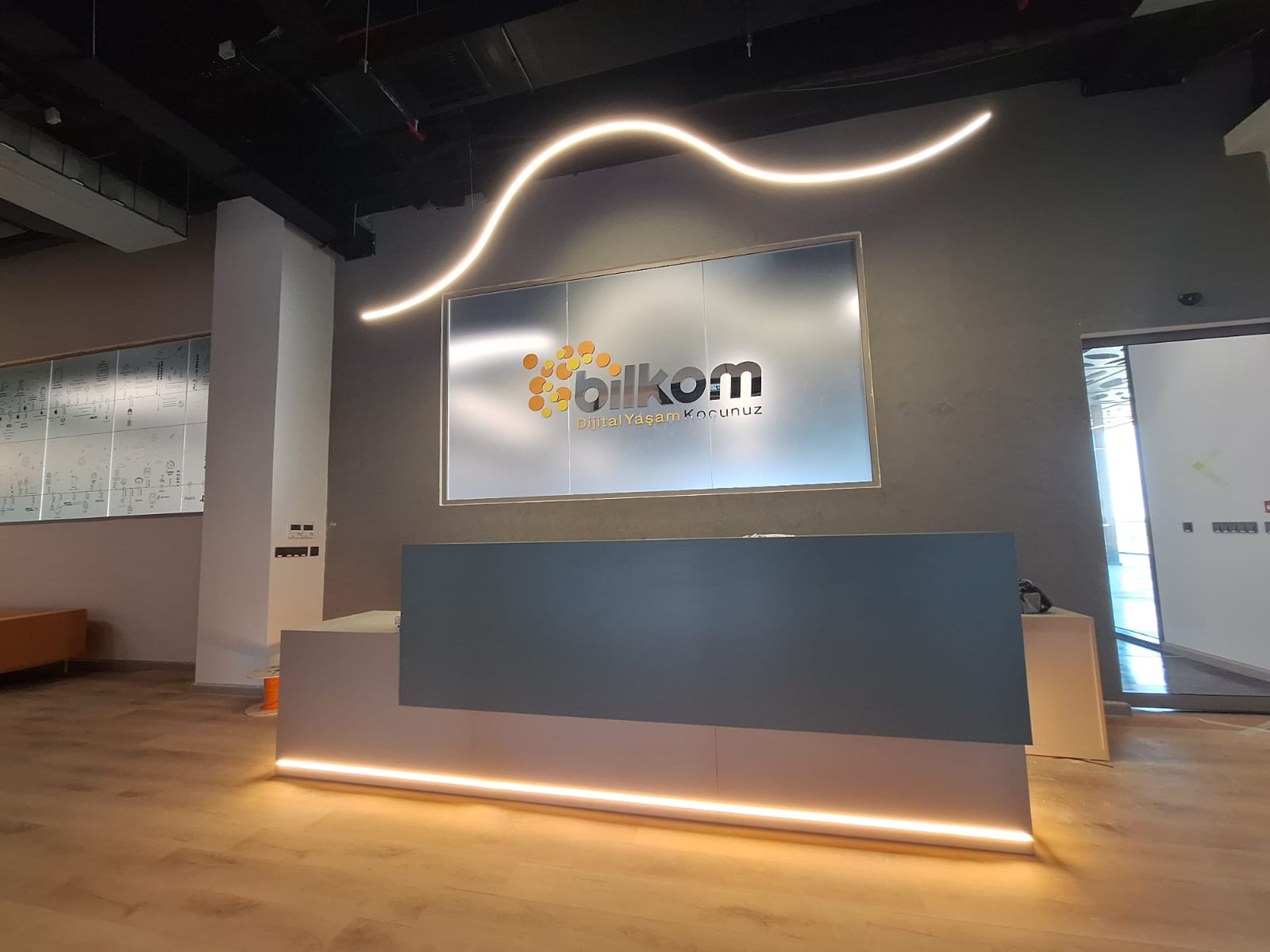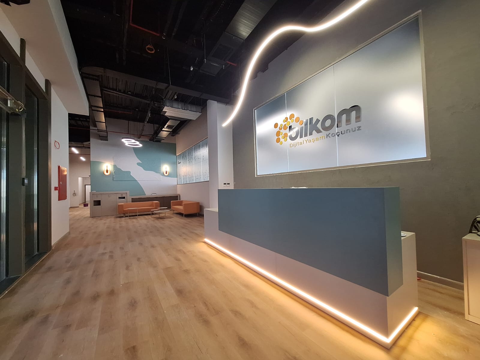 Bilkom İzmir ofisinin giriş bekleme alanı için, markanın kurumsal kimliğini yansıtan bir karşılama alanı tasarlanmıştır. Ziyaretçileri karşılayan bu alan, sade tasarım diliyle konforlu ve davetkâr bir atmosfer sunar.